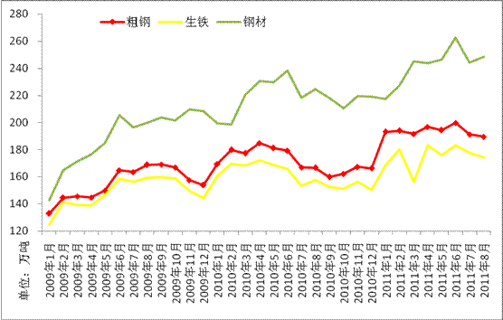 2009年以來(lái)國(guó)內(nèi)鋼、鐵、材日產(chǎn)量走勢(shì)